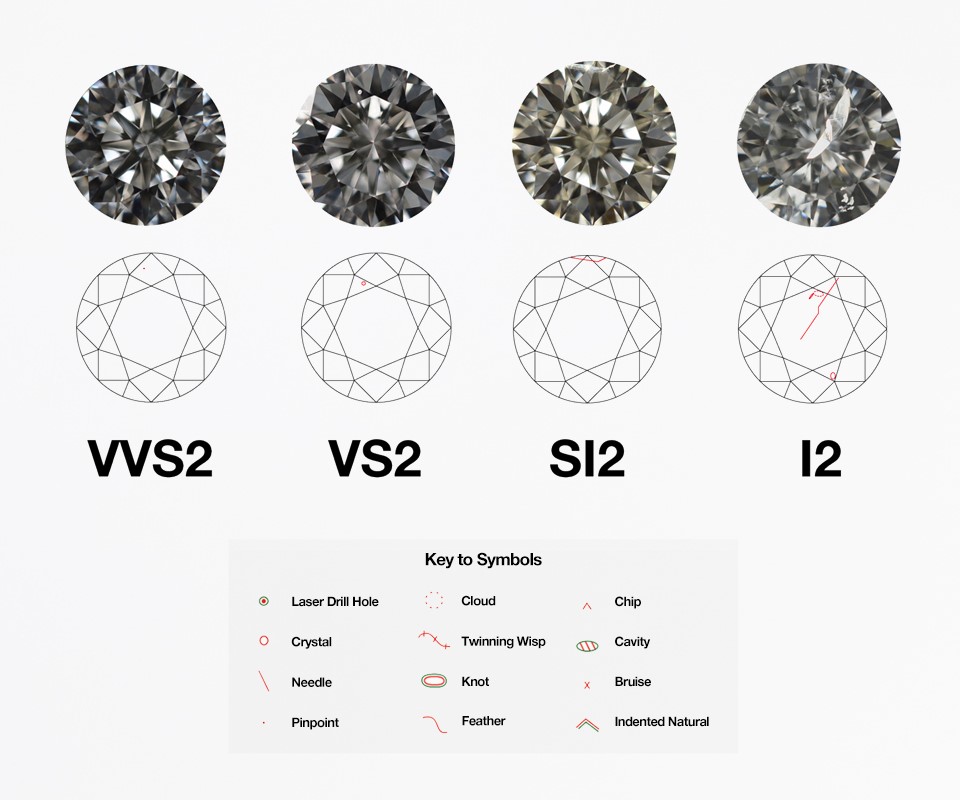 Every diamond is unique. Formed by extreme heat and pressure deep within the earth, it isn’t uncommon for diamonds to contain birthmarks. These clarity characteristics are created when small crystals are trapped in the diamond. As they grow, pressure and stress can cause inclusions and blemishes – sometimes only visible under a microscope. The clarity of a diamond is based on the size, location, visibility and number of inclusions or blemishes. Internal and surface reaching characteristics are called inclusions. External features are called blemishes. Precise clarity grading is the secret to accurately evaluating a diamond. It is essential when buying a diamond to secure an accurate assessment. Many blemishes and inclusions are not visible to the naked eye. Wherever you go in the world, whatever language is spoken, when buying a diamond, you will likely hear terms like VVS1 or SI2 used to describe clarity. Every diamond is evaluated under 10x magnification and assigned a clarity grade. A flawless diamond would receive an (FL) clarity grade; a diamond with obvious inclusions might receive a clarity grade of I3. Diamond clarity grades are based on the number, size, relief, nature, and location of characteristics. The clarity rating of a diamond is a reflection of the overall appearance of the stone – although many of these characteristics will likely not be visible to the naked eye. Every diamond is truly unique, however most diamonds you see in jewelry stores fall between VS (very slightly included) and the SI (slightly included) on the clarity grading scale.